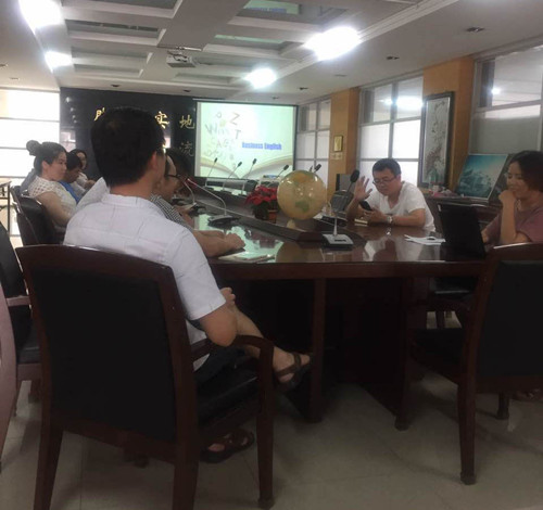 本次活動(dòng)由國(guó)貿(mào)部許經(jīng)理主持,主題是基礎(chǔ)商務(wù)英語的應(yīng)用,圍繞著Welcoming(歡迎詞)、Introduction(自我介紹)、Greetings(招呼問候)、Offering(提議)、Hotel( 酒店)、Small talk topics(閑聊話題)這幾個(gè)話題來開展。首先由國(guó)貿(mào)部許經(jīng)理用一口流利的英語歡迎大家,進(jìn)入第一環(huán)節(jié),先是由各位開發(fā)人員充分運(yùn)用自己的英語能力,介紹了自己的英語名字,個(gè)人的喜好,此環(huán)節(jié)用英語調(diào)動(dòng)開發(fā)人員表達(dá)能力的積極性,用已有的英語水平表達(dá)自己的觀點(diǎn)、意愿,使整個(gè)英語沙龍活動(dòng)沉浸在和諧的氣氛里。第二環(huán)節(jié),由國(guó)貿(mào)部業(yè)務(wù)員扮演了展會(huì)上國(guó)外客戶參觀我司展臺(tái),我司業(yè)務(wù)員接待客戶,講解產(chǎn)品功能的一個(gè)演示,表演過程中表情豐富,語言風(fēng)趣,為全場(chǎng)營(yíng)造了一種活躍熱鬧的氛圍。進(jìn)入后面的Offering(提議)、Hotel( 酒店)、Small talk topics(閑聊話題)幾個(gè)環(huán)節(jié),大家選擇一個(gè)主題,用英語交流演示,此環(huán)節(jié)以一種無比輕松的不同于培訓(xùn)形式的方式給每位開發(fā)人員提供了操練口語的時(shí)機(jī),激發(fā)了開發(fā)人員學(xué)習(xí)英語的熱心。