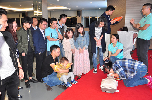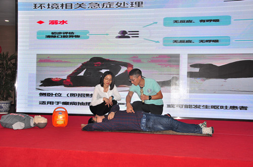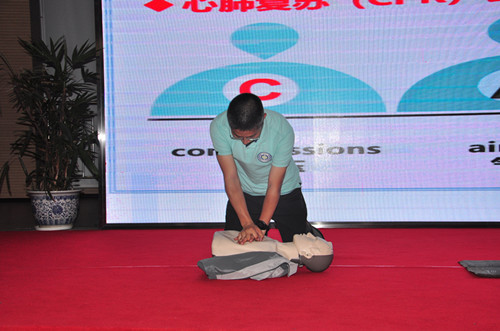 培訓(xùn)期間陳老師運(yùn)用醫(yī)學(xué)理論結(jié)合現(xiàn)實(shí)案例深入淺出的分享了日常生活的應(yīng)急救護(hù)知識(shí):如日常生活的關(guān)節(jié)扭傷,出血、燙傷和高溫急癥的方法處理,并通過(guò)現(xiàn)場(chǎng)演示、指導(dǎo)體驗(yàn)等方式,展示了側(cè)臥位休息式,心肺復(fù)蘇的急救技能,強(qiáng)調(diào)當(dāng)傷員發(fā)生沒(méi)有反應(yīng)且沒(méi)有呼吸,發(fā)生心臟驟停時(shí)急救的“黃金四分鐘時(shí)間”,如何有效進(jìn)行應(yīng)急救護(hù)。并現(xiàn)場(chǎng)指導(dǎo)員工進(jìn)行心肺復(fù)蘇術(shù),自動(dòng)體外除顫儀(AED)的操作,普及日常應(yīng)急救護(hù)知識(shí)。