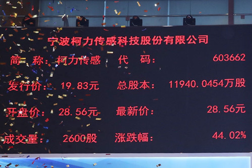 2019年8月6日,柯力傳感(股票代碼:603662)正式在上交所掛牌上市,N柯力以19.83元/股開盤,強勢封漲停板,首日漲幅達44.02%。公司本次公開發(fā)行2985.0114萬股,發(fā)行市盈率22.98倍,是寧波轄區(qū)在A股上市的第79家企業(yè),是上交所第1488家掛牌企業(yè)。