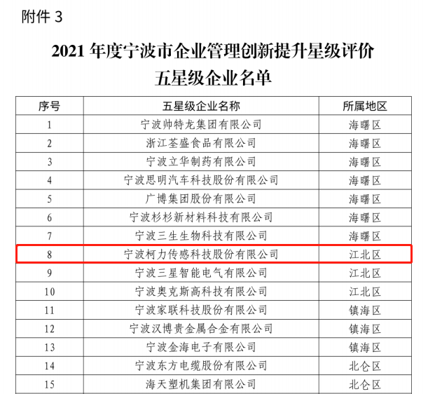 寧波市經(jīng)濟(jì)和信息化局下發(fā)關(guān)于公布2021年度寧波市企業(yè)管理創(chuàng)新提升星級(jí)評(píng)價(jià)四星級(jí)、五星級(jí)企業(yè)的通知。根據(jù)前期各地星級(jí)評(píng)價(jià)情況,市經(jīng)信局通過(guò)專家復(fù)審、集中評(píng)審,認(rèn)定四星級(jí)企業(yè)391家,五星級(jí)企業(yè)110家,其中寧波柯力傳感科技股份有限公司獲批五星級(jí)企業(yè)。
